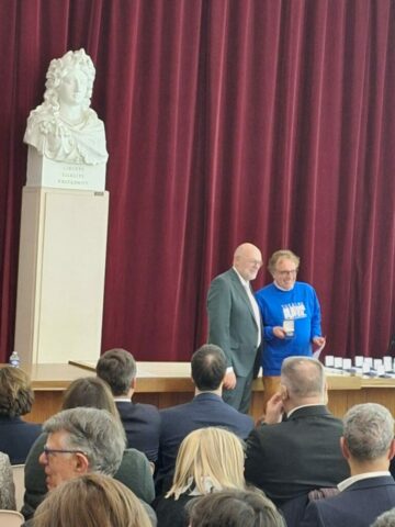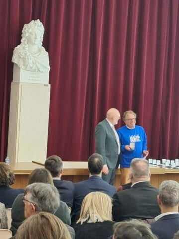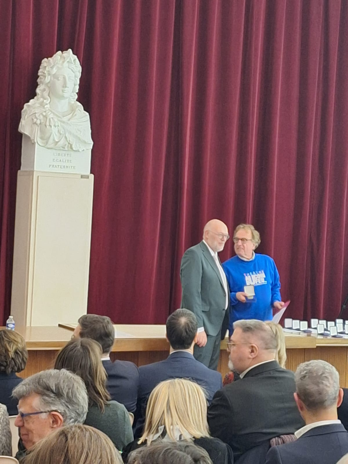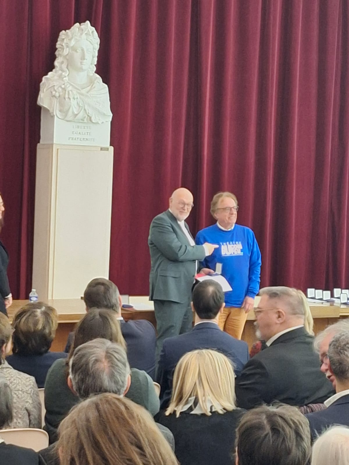 Entouré de quelques membres du « Théatre au coin du feu ou du barbeuc ça dépend des saisons » Pierre Lascombe, président fondateur de l’association à reçu des mains de M Olivier Caremelle Maire de Lomme la médaille de la ville. Distinction qui souligne l’engagement de l’association dans le tissu associatif de Lomme. Bravo Pierre (et tous les membres de l’association) et continuez!!